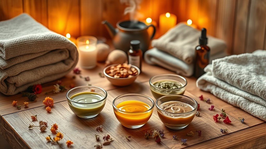 Create your own relaxing at-home spa kit with natural ingredients like honey, yogurt, avocado, or oatmeal to make soothing face masks. Add calming relaxation techniques such as deep breathing, gentle facial massage, or calming music to enhance your experience. After removing the masks, remember to hydrate your skin with a lightweight moisturizer. Focusing on these simple steps can turn your self-care routine into a calming escape—keep exploring to discover even more tips.