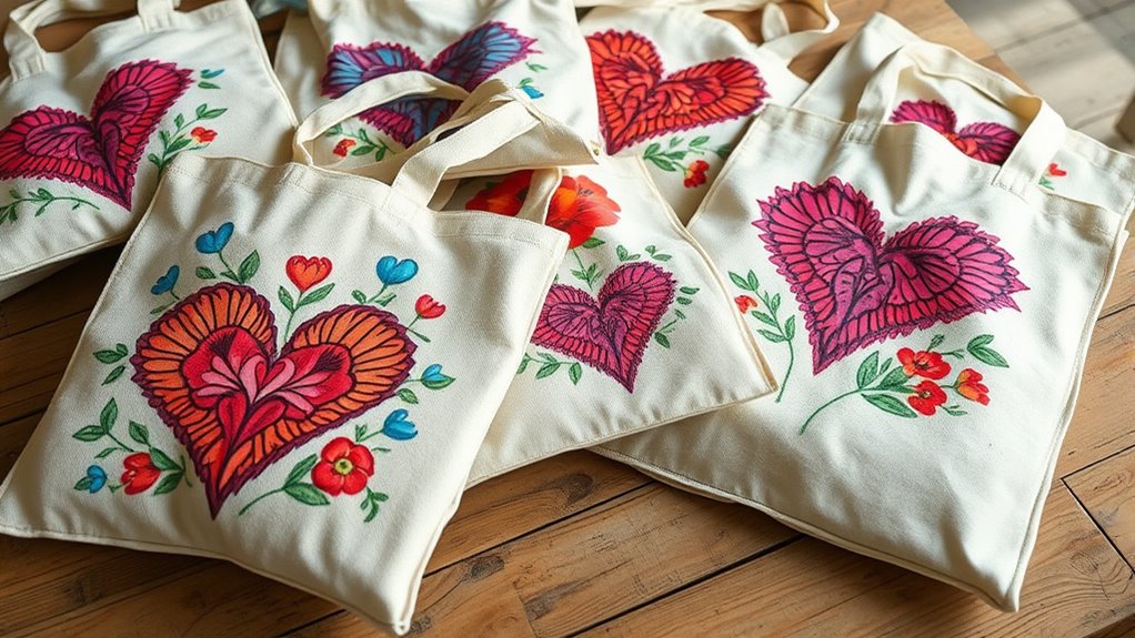 Creating a hand-painted tote bag is a heartfelt way to make a sustainable, personalized gift for your Valentine. You can choose eco-friendly fabrics like organic cotton or recycled canvas and use non-toxic dyes to bring your design to life. Whether adding love-themed symbols or heartfelt messages, your personalized tote reflects your creativity and care for the planet. Keep exploring to discover easy tips and ideas for crafting your own unique, eco-conscious gift.
