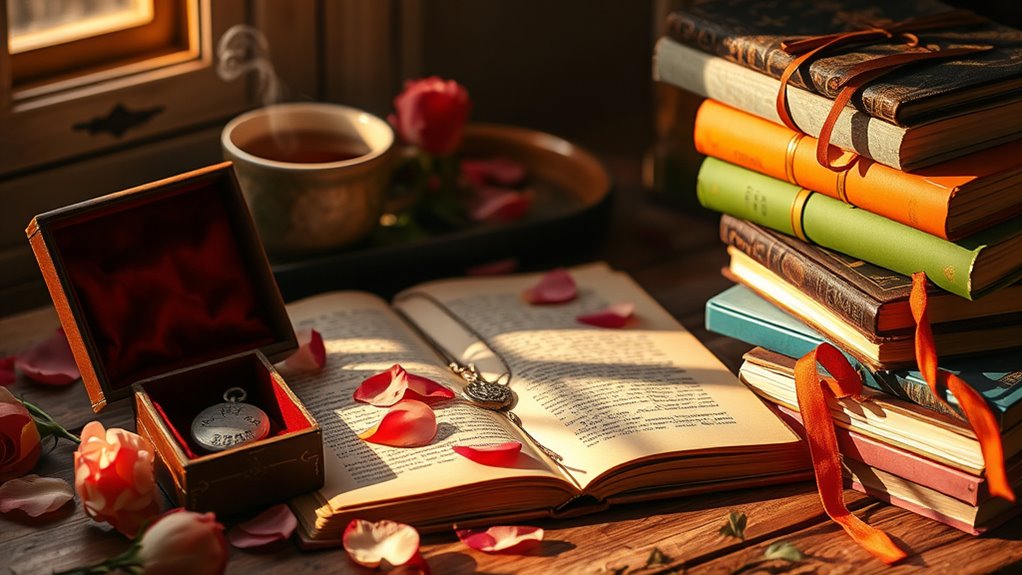 Choosing the perfect romantic novel is like finding a soulmate—look for book compatibility that matches your partner’s taste. Think about their favorite settings or themes, like heartfelt journeys or witty banter. An emotional connection to the story makes it memorable. Pay attention to their past favorites, and consider asking subtle questions to guide your choice. When you pick right, you’ll create a gift that truly resonates and deepens your bond.