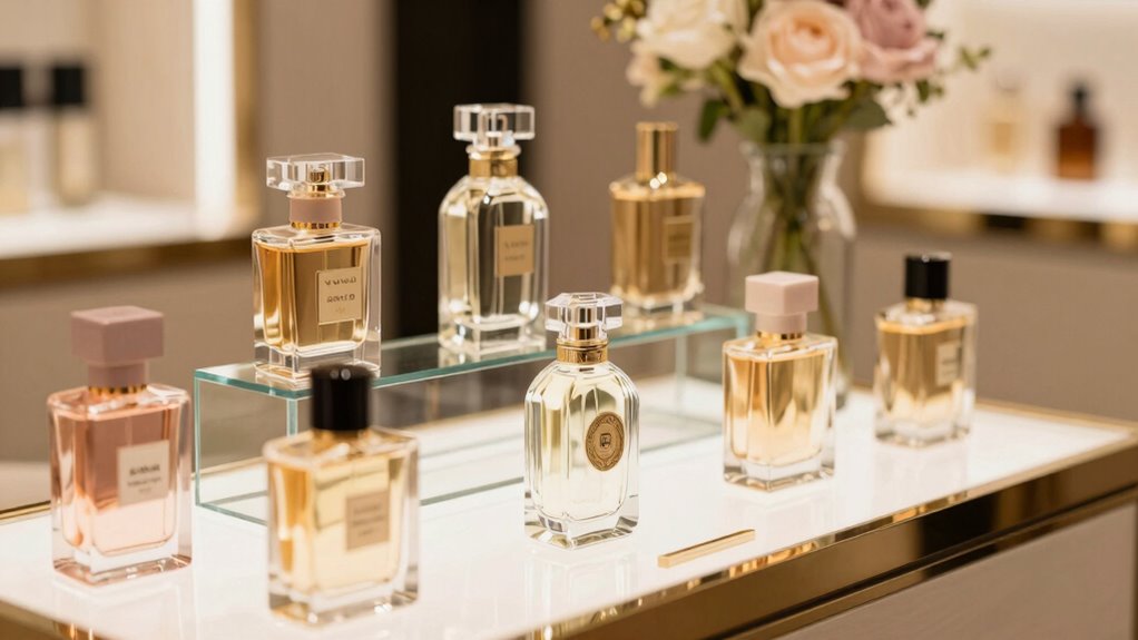 To guarantee the authenticity of luxury perfumes, buy from reputable sources like official brand boutiques or trusted retailers. Check for genuine packaging, including seals and labels, and examine the perfume’s consistency and scent note complexity. Be cautious of counterfeit fragrances, which often lack the nuanced fragrance layering found in authentic perfumes. Authentic luxury scents also have a refined perfume note complexity that counterfeit versions usually lack, confirming their legitimacy.