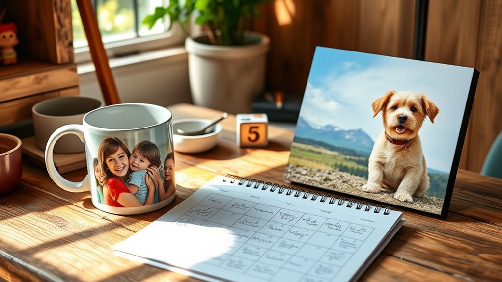 Creating personalized photo gifts like custom calendars, mugs, and canvases lets you turn your favorite moments into meaningful keepsakes. You can showcase your cherished images in unique ways that brighten daily routines or decorate your space. Whether you choose a calendar filled with special memories or a canvas highlighting a favorite photo, these Gifts add a personal touch that shows thoughtfulness. Keep exploring to discover more ideas for turning your photos into heartfelt presents.