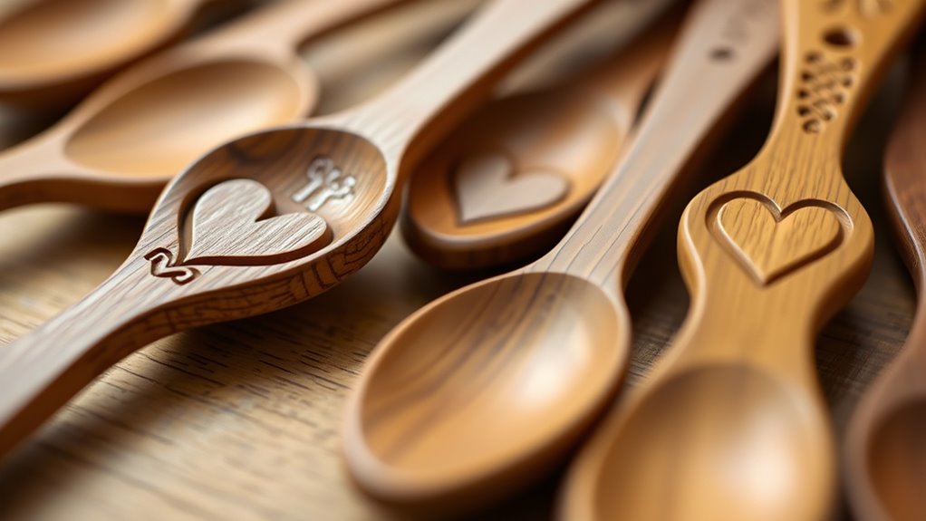 You’ll find that common symbols on Welsh love spoons include hearts, arrows, and knots, each carrying special meanings like love, direction, or eternity. Carving techniques involve intricate detailing and smooth finishes to enhance the symbols’ significance. When you create or observe these spoons, you’ll notice how the symbol meanings and skilled carving techniques come together, making each piece a heartfelt token of affection and tradition.