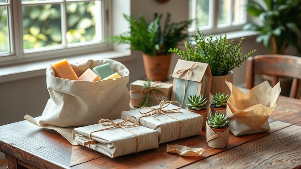 To wrap zero-waste gifts creatively, you can use reusable wrapping like cloth or scarves, which add a personal touch and can be reused. Get inventive with creative packaging by repurposing old maps, fabric scraps, or newspaper. Add a natural element with twine, dried flowers, or tags made from recycled paper. This thoughtful approach not only looks beautiful but also aligns with your eco-friendly values.