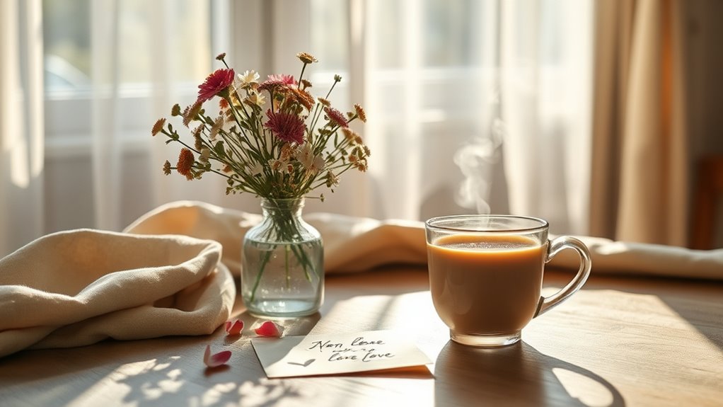 Imagine your camera as a love letter waiting to be written. For each day, choose romantic motifs like roses or hearts, and complement them with themed props such as vintage keys or handwritten notes. Dedicate days to themes like “Sweet Serenade,” “Cherished Moments,” or “Love in Bloom.” These creative themes help you craft a visual story, transforming simple photos into heartfelt expressions of affection that resonate beyond the lens.