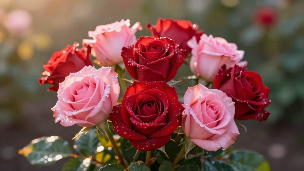 Different colored roses carry specific meanings in flower symbolism, making them perfect for romantic gestures. For example, red roses symbolize love and passion, white roses represent purity and innocence, yellow signifies friendship, and pink conveys admiration. When you give someone these roses, you’re expressing your feelings clearly without words. Choosing the right color shows thoughtfulness and adds depth to your romantic gesture, making Rose Day even more special.