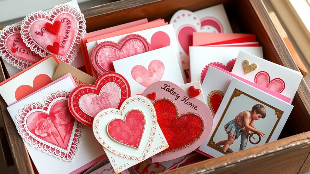 Did you know early handmade Valentine’s Day cards often used just 100% handmade paper? You’d find natural dyes like beetroot, indigo, and turmeric to color them, making each card unique. People carefully crafted these with simple tools, adding personal touches that made each message special. The use of handmade paper and natural dyes gave these cards an authentic, rustic charm that’s still appreciated by collectors today.