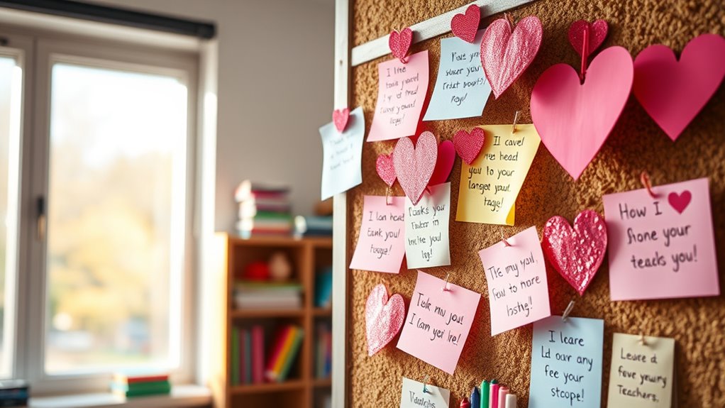 When you write your Valentine notes, consider how classroom decorations play a role in making learning more engaging. Decorations aren’t just for aesthetics; they set the tone for a dynamic learning environment and can boost student engagement by making lessons more visually appealing. Mentioning specific decorations or classroom themes that resonated with you can personalize your message and demonstrate your appreciation for the teacher’s effort to create a lively, inviting space. For example, praising a colorful bulletin board or a creatively decorated reading corner shows that you recognize their dedication to making the classroom a place where students want to learn. Your words can highlight how these visual touches help you stay focused and excited about schoolwork, emphasizing the teacher’s role in fostering a positive and engaging atmosphere. Additionally, maintaining the classroom environment with well-chosen decorations can support the teacher’s goal of creating an inspiring space for learning.