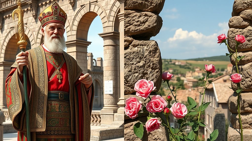 Saint Valentine of Rome is known for secretly performing marriage ceremonies for lovers, symbolizing love and defiance against Emperor Claudius II’s ban on marriage. In contrast, Valentine of Terni was a bishop and healer martyred for his faith, focusing on sacrifice rather than love rituals. While their stories differ—one emphasizing romantic love, the other faith—they both highlight themes of love, sacrifice, and societal values. If you keep exploring, you’ll discover how these legends shaped Valentine’s Day traditions.