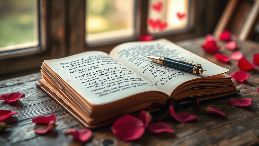 Have you ever wondered how a simple poem can express the depth of your feelings on Valentine’s Day? Crafting your own romantic verses allows you to communicate your affection in a deeply personal way. When you start writing, pay attention to poetry structure; understanding how to organize your poem helps it flow naturally and resonates emotionally. You might choose a traditional form like a sonnet, with its 14 lines and specific rhyme scheme, or a free verse that gives you more flexibility. The key is to find a structure that supports your message, making your feelings clear and impactful. As you develop your poem, think about incorporating romantic metaphors—these are vivid comparisons that evoke emotion and paint a picture of love in the reader’s mind. For example, comparing your partner’s smile to the sunrise or their voice to a gentle melody creates a strong emotional connection. Using metaphors makes your poetry more vivid and memorable, because they tap into universal feelings and experiences.