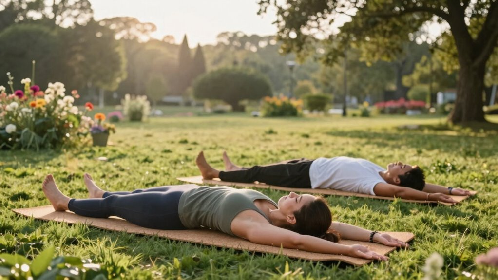 Eco-friendly materials are a crucial factor to contemplate when selecting cork yoga mats for couples. Cork is a sustainable, renewable resource harvested every nine years without harming trees, making it an environmentally responsible choice. It’s biodegradable, non-toxic, and free from harmful chemicals like PVC, TPE, and silicones, ensuring a safer practice space. Many cork mats feature a self-cleaning surface that resists odors, bacteria, and mold, reducing reliance on chemical cleaners. The manufacturing process has minimal environmental impact, and numerous brands support eco initiatives like reforestation and carbon offsetting. Since cork is naturally free from synthetic dyes and toxins, it promotes a healthier environment for both partners during their yoga sessions. Choosing cork mats rooted in eco-friendly materials aligns with sustainable living and mindful exercise.