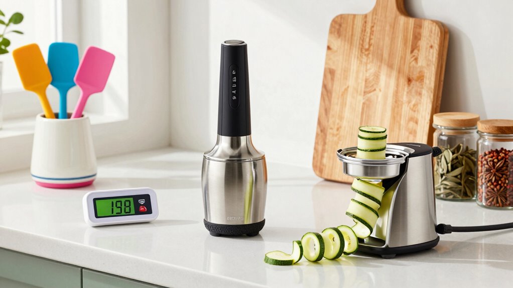 If you’re dealing with a small kitchen, I recommend compact gadgets that maximize space. I love a foldable silicone spatula, a multi-use blender with a sleek design, and stackable storage containers. A slim, wall-mounted knife rack keeps counters clear, while a magnetic spice rack saves cabinet space. These gadgets are space-efficient, practical, and make cooking easier without cluttering your small kitchen.