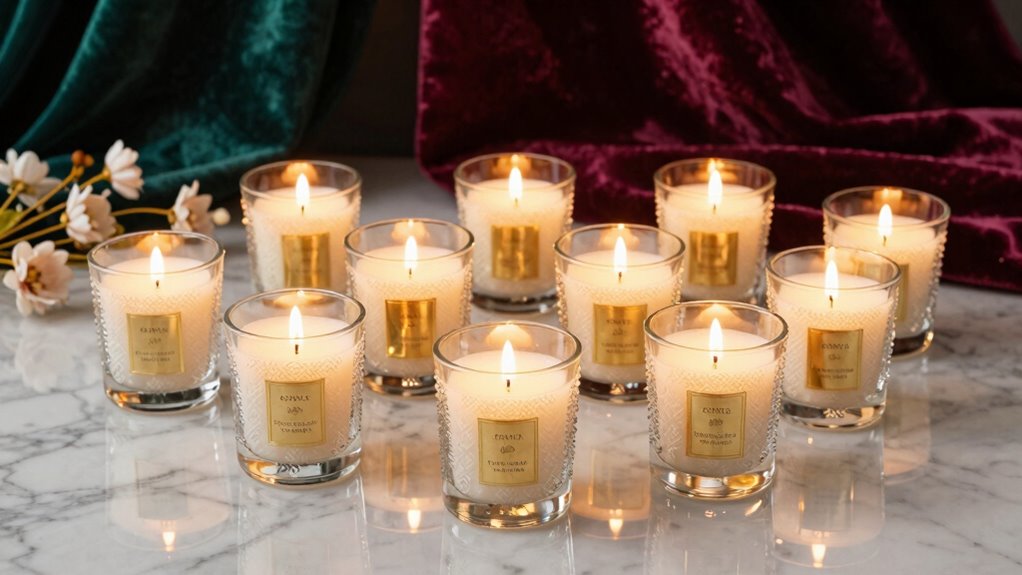 Luxury scented candles usually burn for about 50 to 60 hours, depending on their size and ingredients. I find that larger candles tend to last longer, making them a great investment for ongoing enjoyment. To get the most out of your candle, I recommend trimming the wick before each use and avoiding drafts. Proper care guarantees a clean, even burn, letting you savor those luxurious scents for as long as possible.