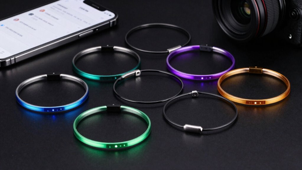 Safety features are a vital aspect to contemplate when selecting a mood bracelet connected via app, especially for those who want peace of mind in emergencies. Many of these bracelets let you send an SOS with a simple hold of three seconds, alerting multiple contacts simultaneously. This guarantees help can be on the way quickly, even if your phone isn’t nearby or offline. The SOS function works independently of the app, providing instant access during urgent moments. Real-time location sharing adds an extra layer of security, letting trusted contacts track your whereabouts. Customizable emergency contacts and alert protocols also enhance safety, allowing you to tailor responses to your needs. Overall, these features make mood bracelets reliable tools for staying safe in unpredictable situations.