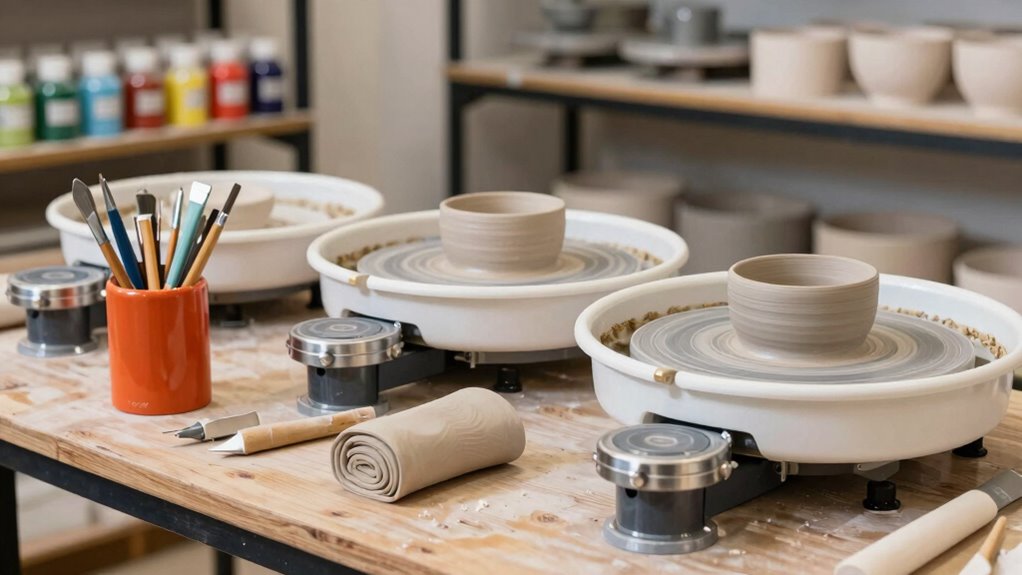 You’ll want about 3 to 4 feet of clearance around your pottery wheel for comfortable operation. Notably, most beginner wheels are designed to fit in small spaces, making them perfect for studios or apartments. I recommend setting aside a dedicated area with enough room for your tools and clay. This way, you can work freely without feeling cramped, ensuring a smooth and enjoyable pottery experience from start to finish.