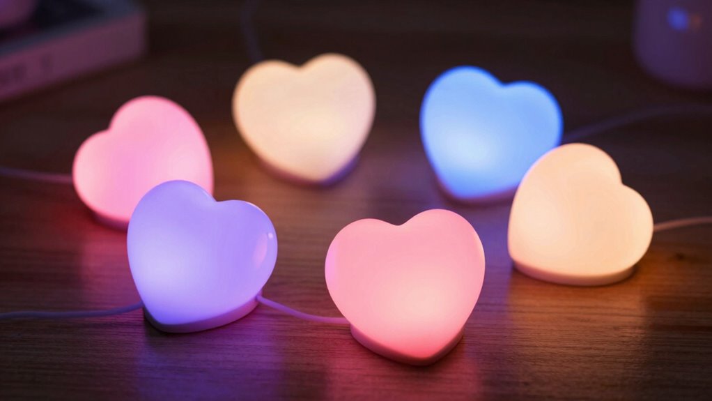 If you’re looking for the 15 best USB heart-shaped night lights for 2026, I’ve found some charming options that suit every need. From salt lamps and projection lights to touch sensors and colorful RGB designs, these lights combine beauty, safety, and convenience. Whether for romantic occasions, nursery decor, or travel, there’s something for everyone. Keep exploring, and you’ll discover details on features, materials, and tips to pick the perfect one for you.