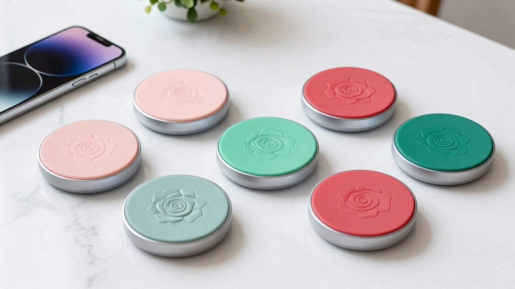 Ever wondered how a wireless charging pad’s design can elevate your space? Rose-designed pads do more than just charge your devices—they add a touch of elegance. Their floral motifs and petal-like shapes create a romantic, feminine vibe that complements stylish decor. Soft pinks, blush tones, and metallic rose gold finishes make them feel luxurious and sophisticated. Designers often incorporate textured surfaces or glossy plastics that mimic flower petals, enhancing the botanical theme. Subtle LED indicators and minimalist branding keep the design refined and unobtrusive. When choosing a rose-themed charger, consider how its aesthetic aligns with your space. The right design can make your charging station a beautiful focal point, blending function with artistic appeal seamlessly.